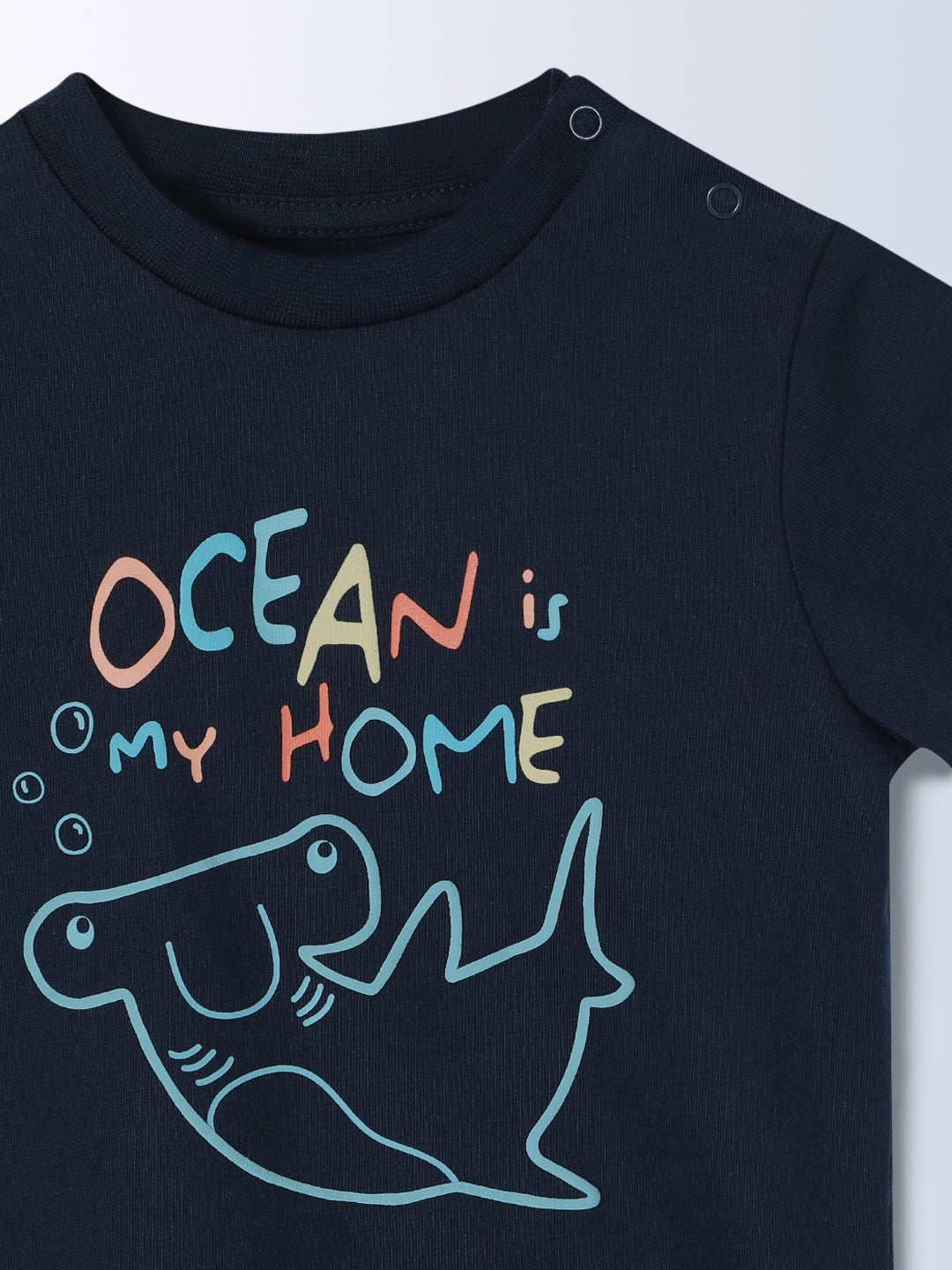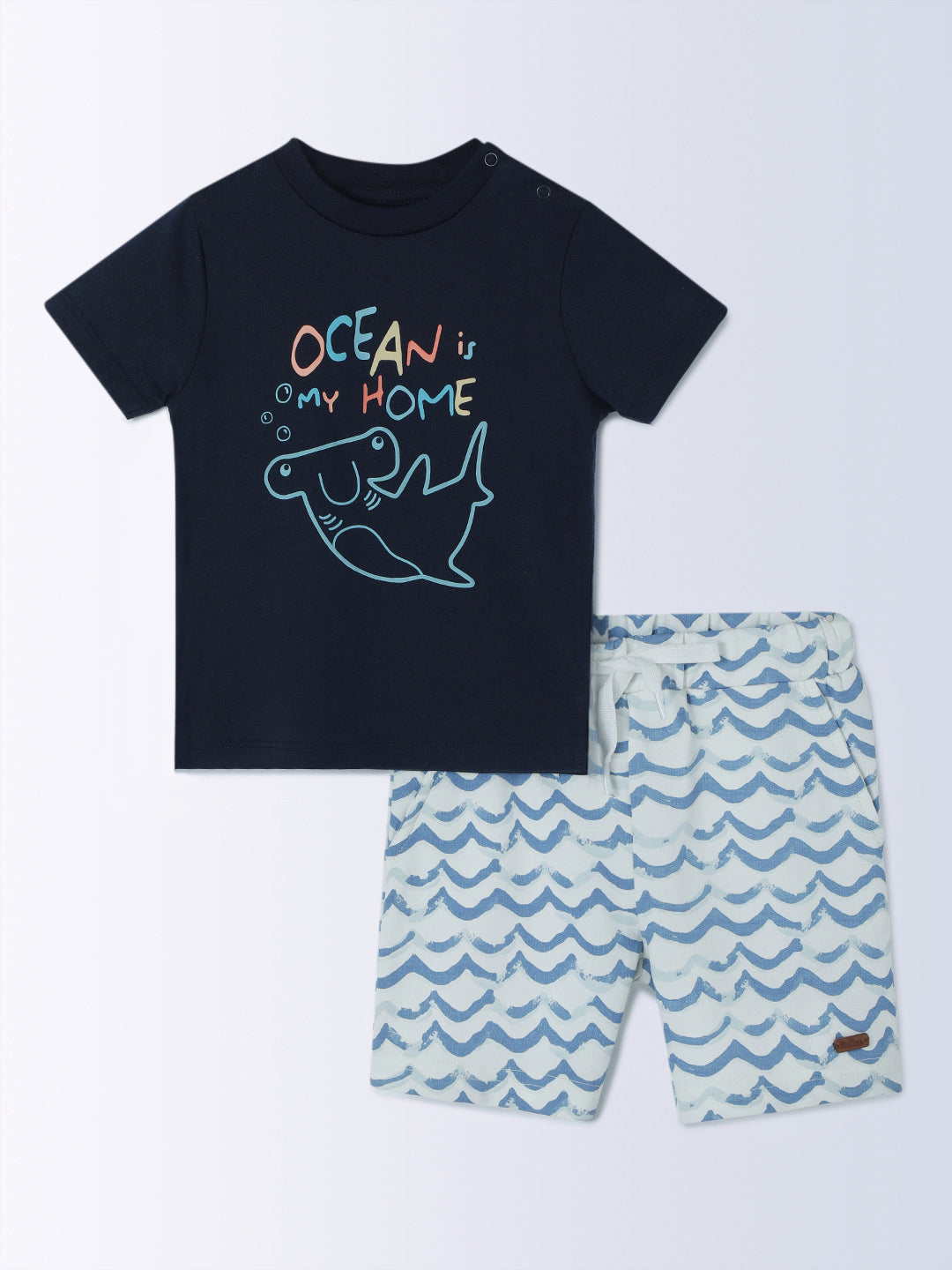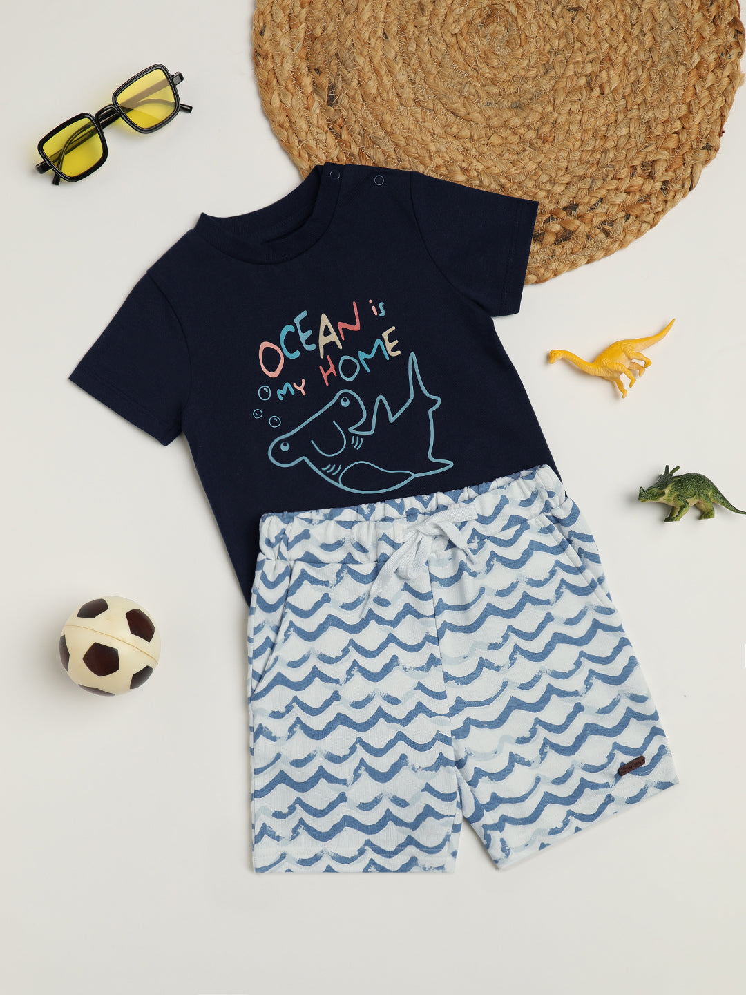 Boys Half sleeve Crew neck T-shirt with chest print with printed woven shorts with functional pockets. Crafted with the soft 100% Cotton fabric, treated with bio wash, to ensure the safest and most comfortable clothing for the young ones.