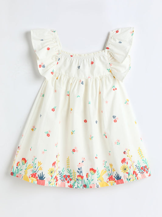 Milou Kids Cotton Printed Bio Washed Dress for Girls -Off White