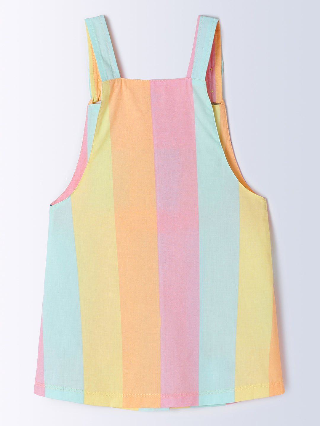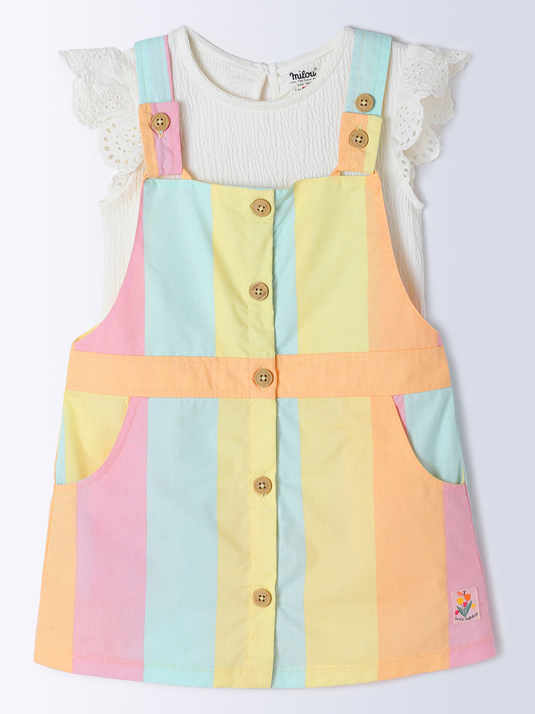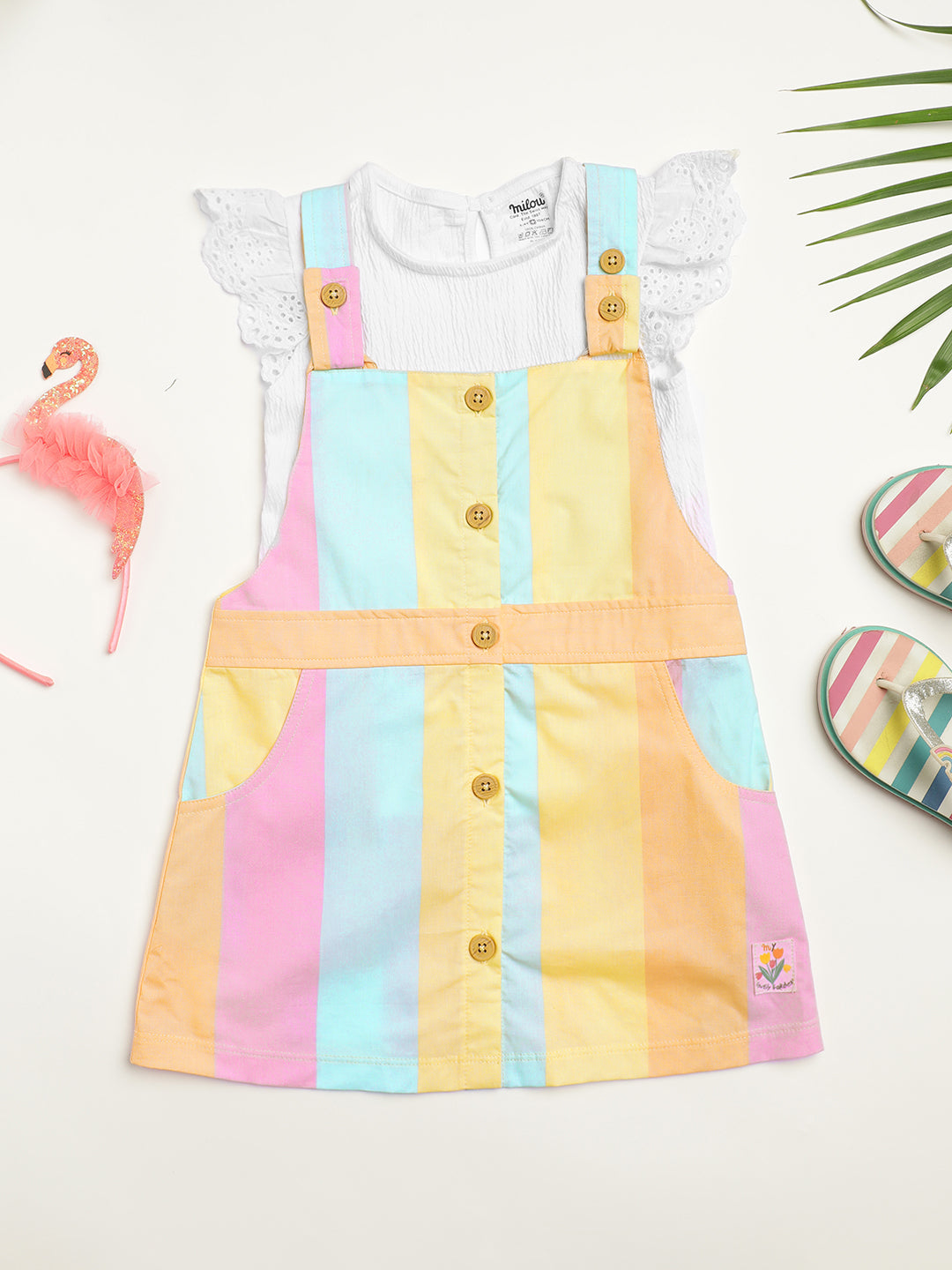 Striped Pinafore with white ruffled top set. Crafted with the soft 100% Cotton fabric, treated with bio wash, to ensure the safest and most comfortable clothing for the young ones.