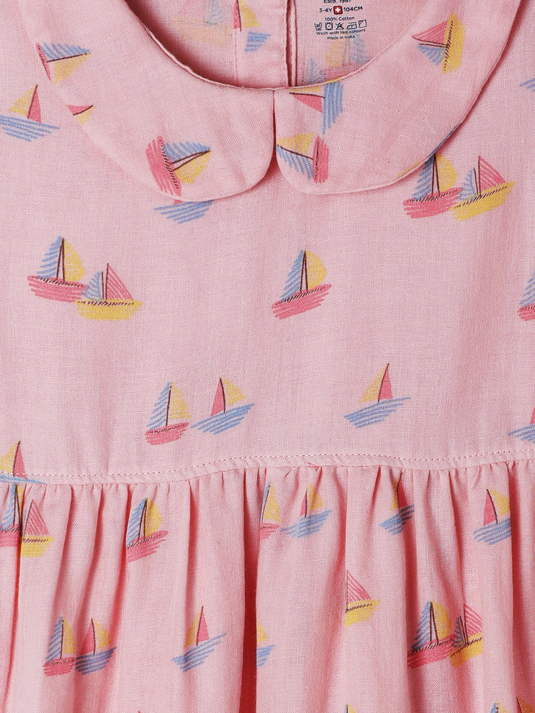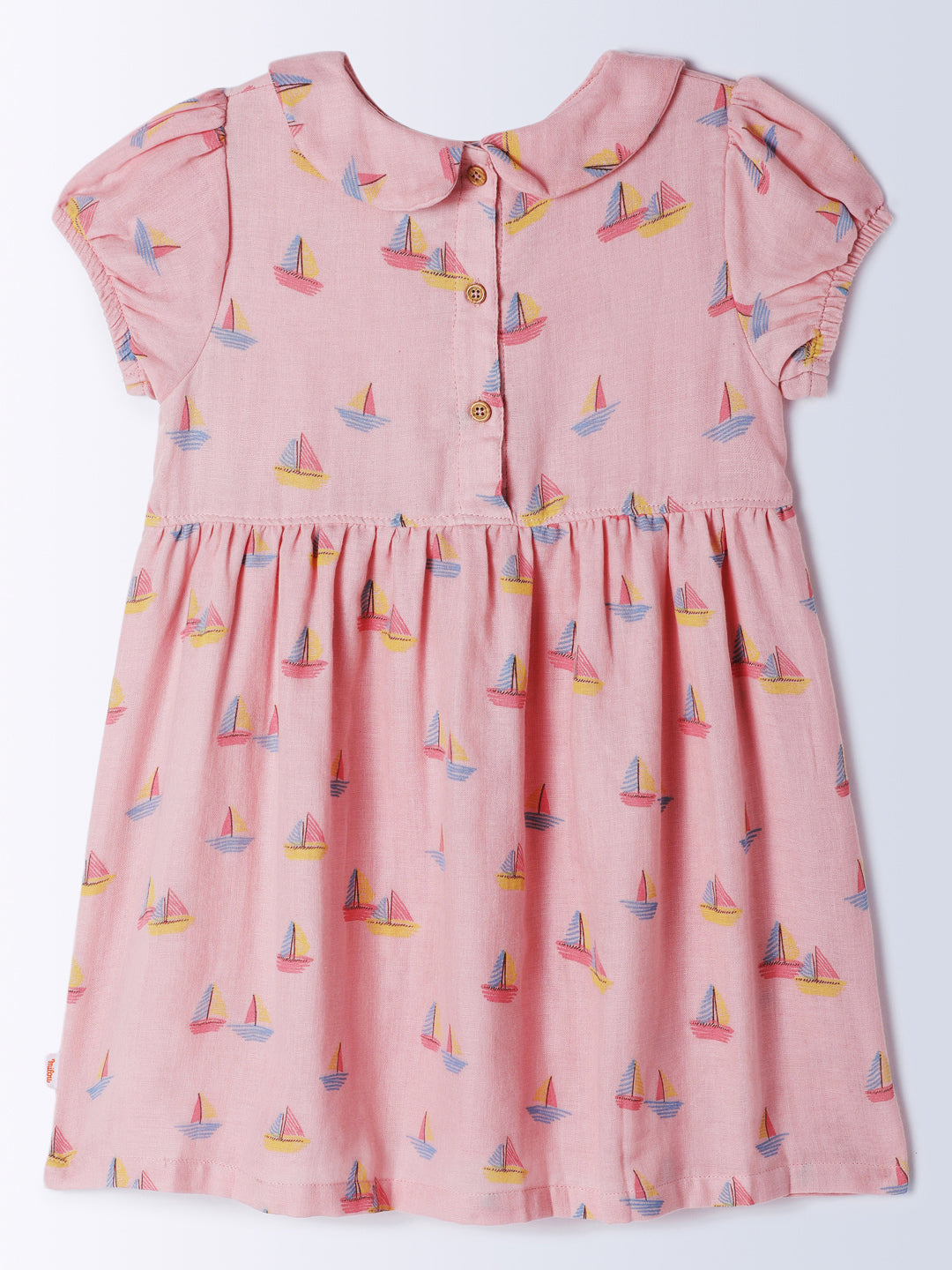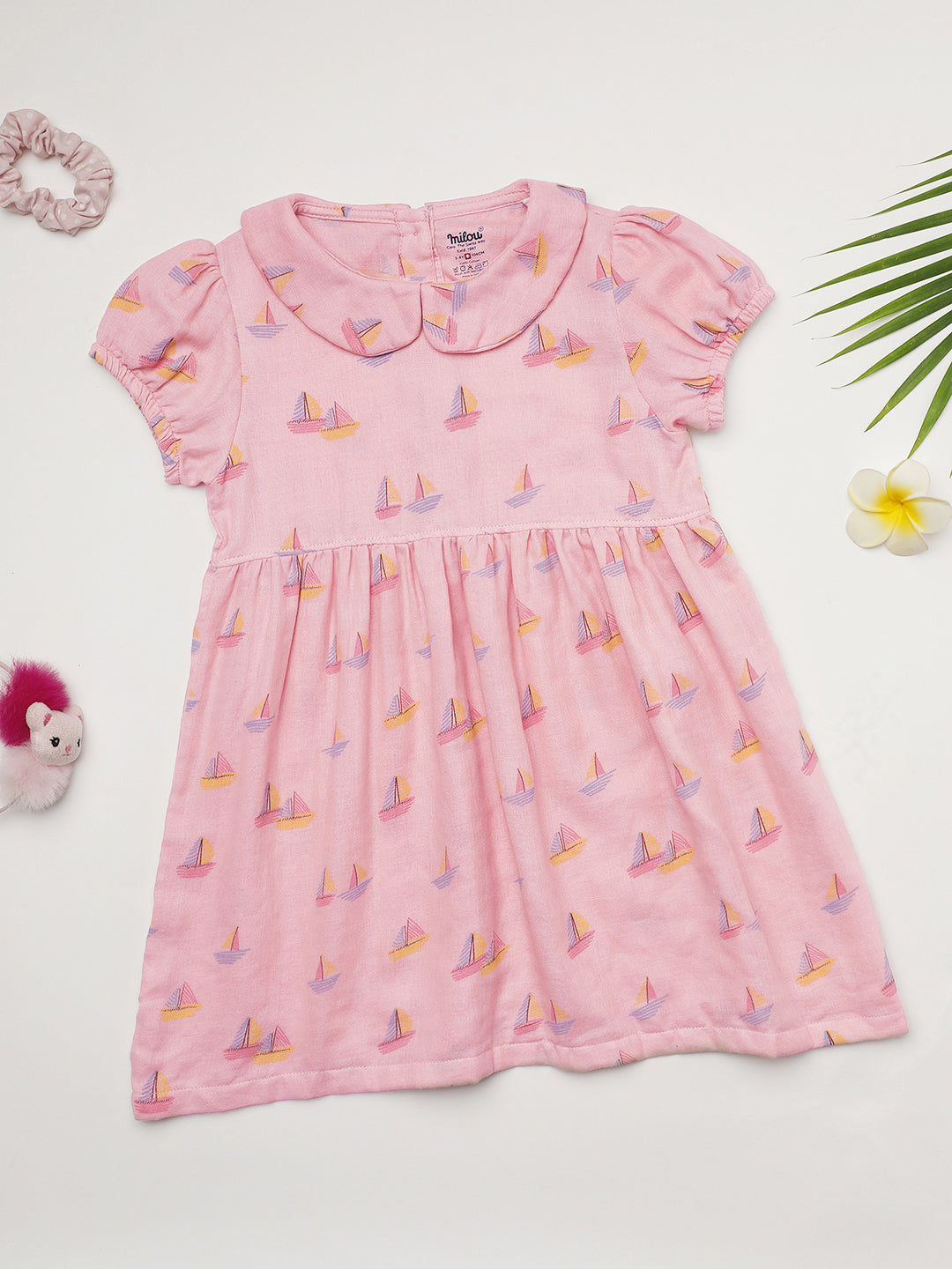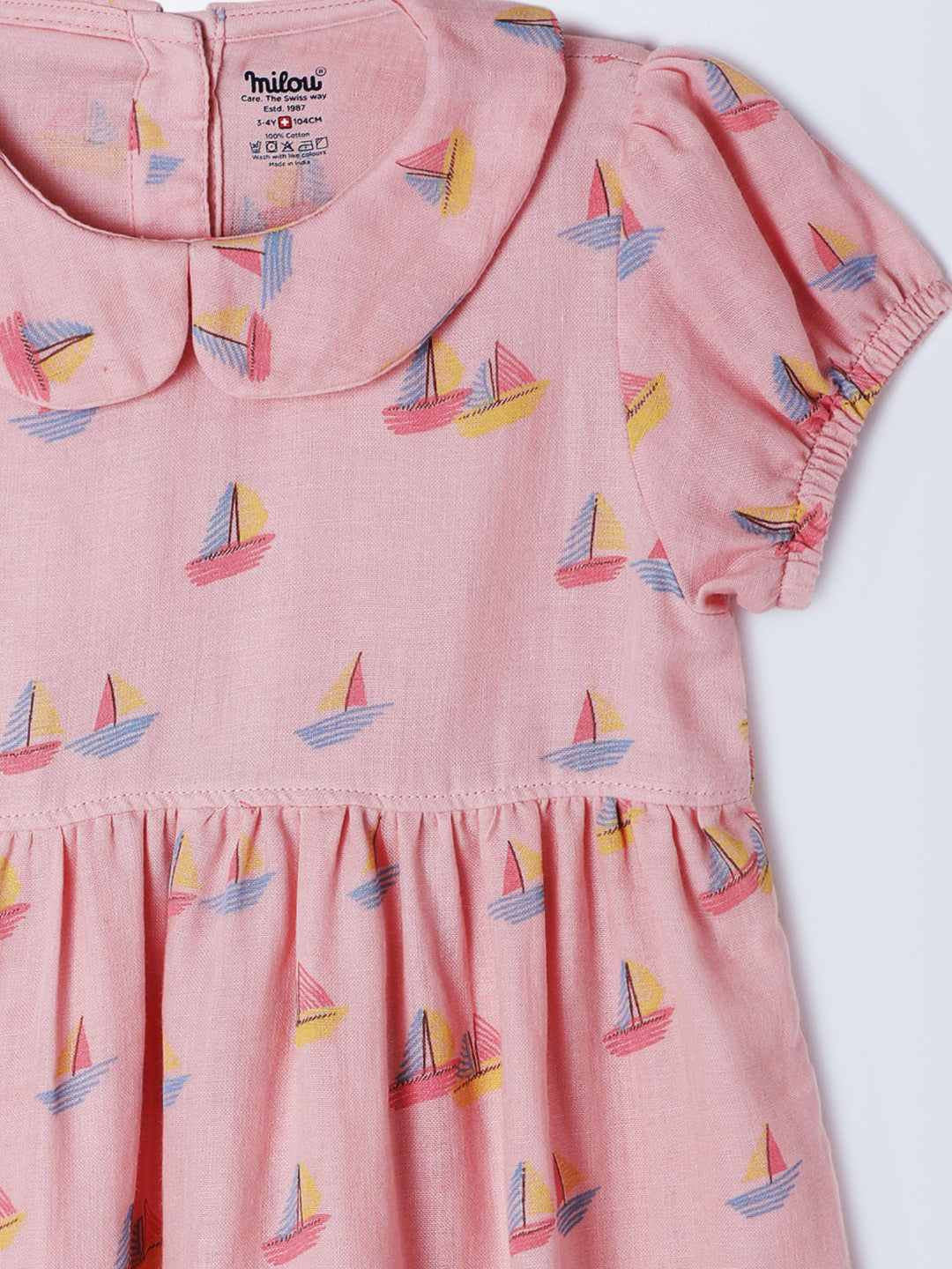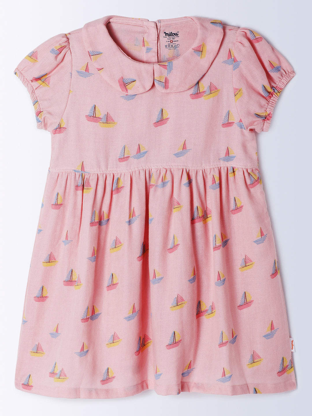 Milou Kids Cotton Short Sleeve Printed Bio Washed Dress for Girls - Pink