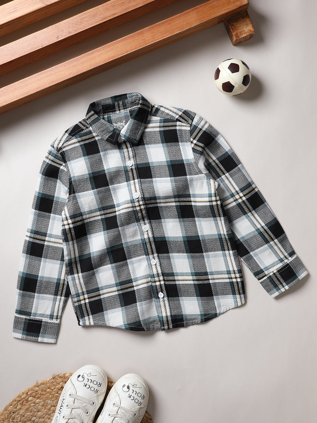Boys' Full sleeve Woven Shirt with Checked. Crafted with the soft 100% Cotton fabric, treated with bio wash, to ensure the safest and most comfortable clothing for the young ones.
