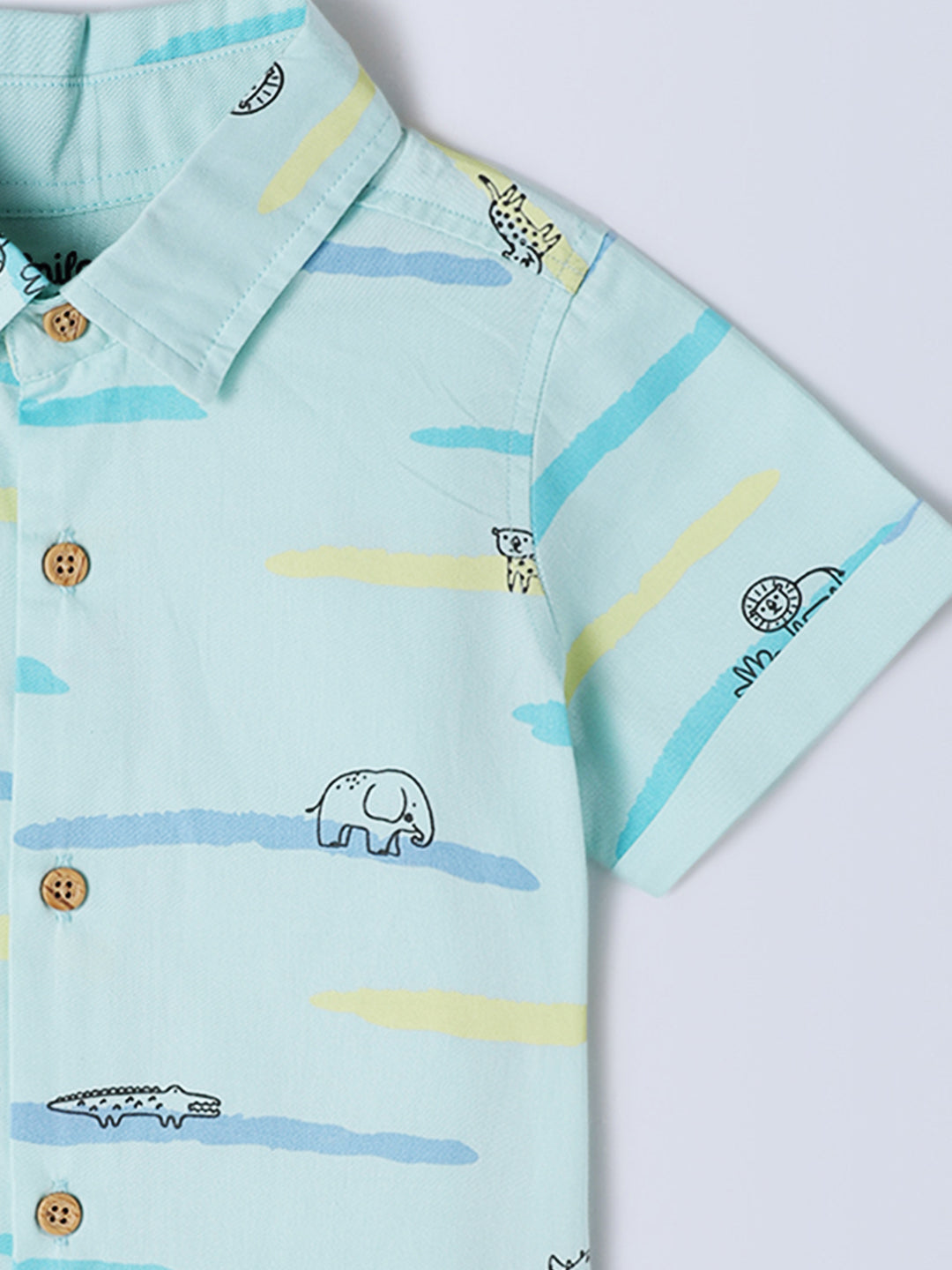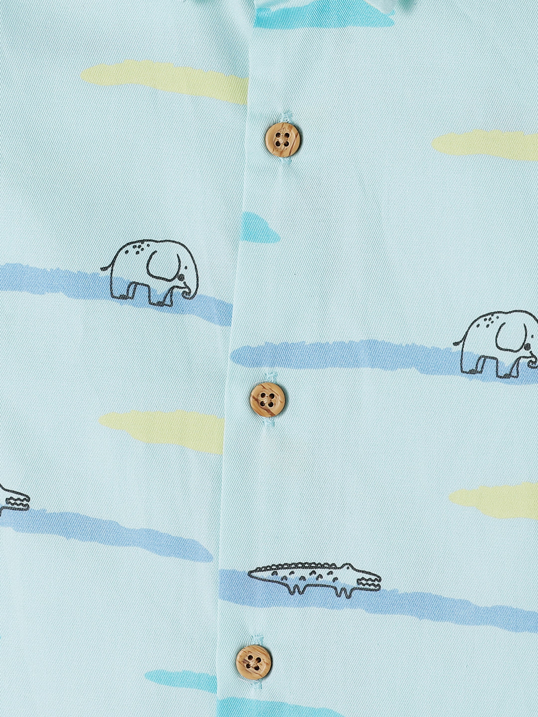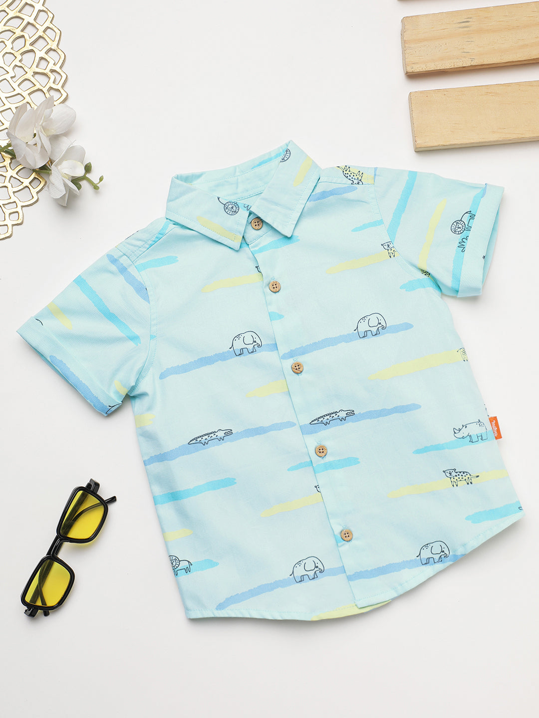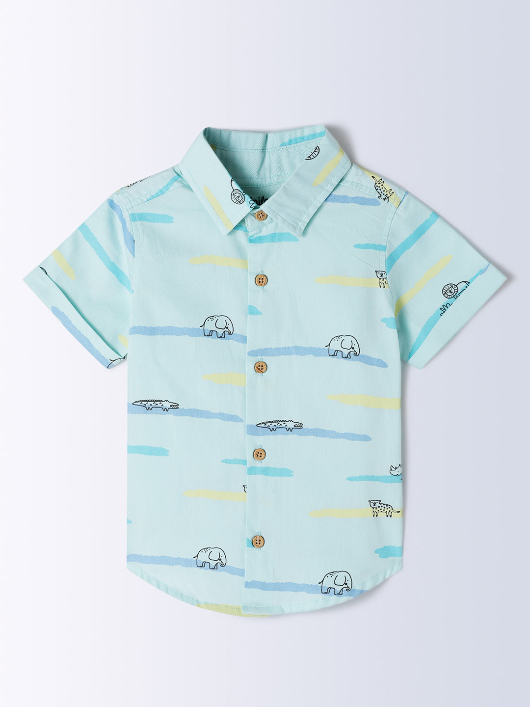 Boys' half sleeve Woven Shirt with all over prints. Crafted with the soft 100% Cotton fabric, treated with bio wash, to ensure the safest and most comfortable clothing for the young ones.