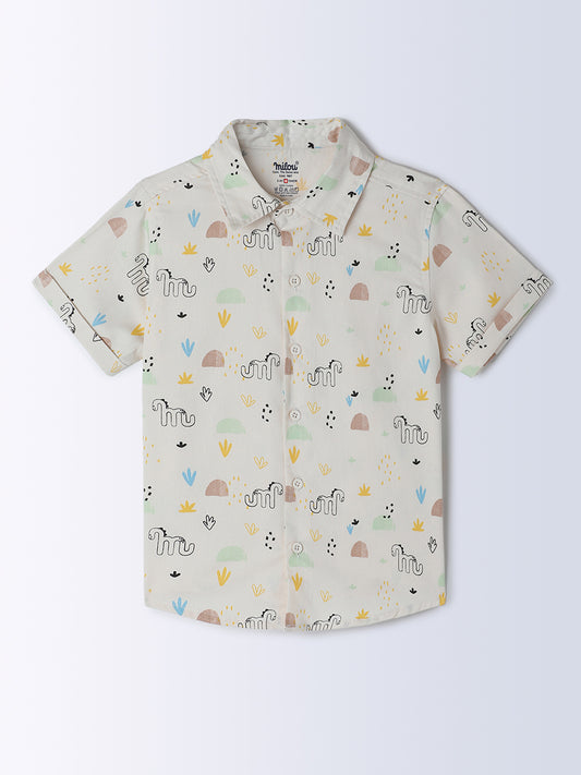 Milou Kids Cotton Half Sleeves All Over Printed Bio Washed Shirt for Boys -Off-White