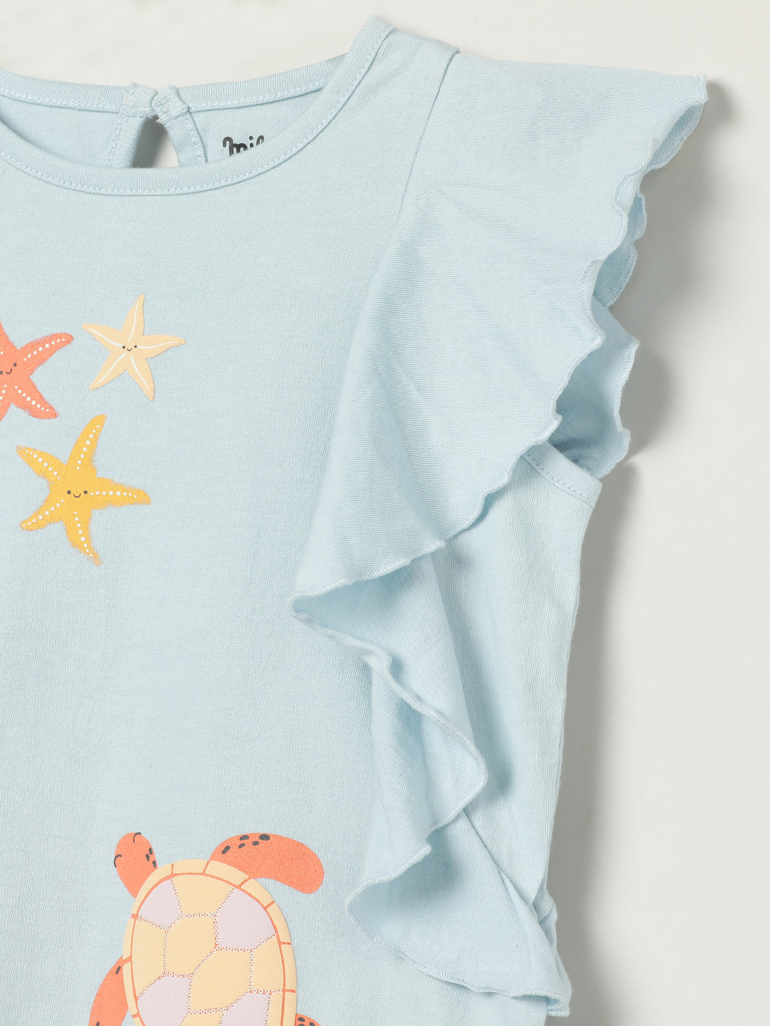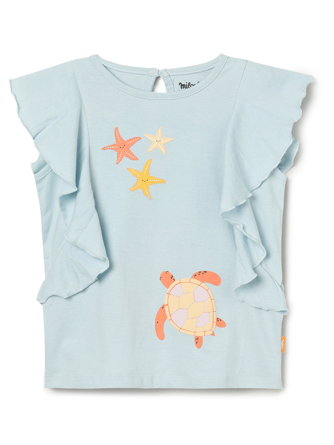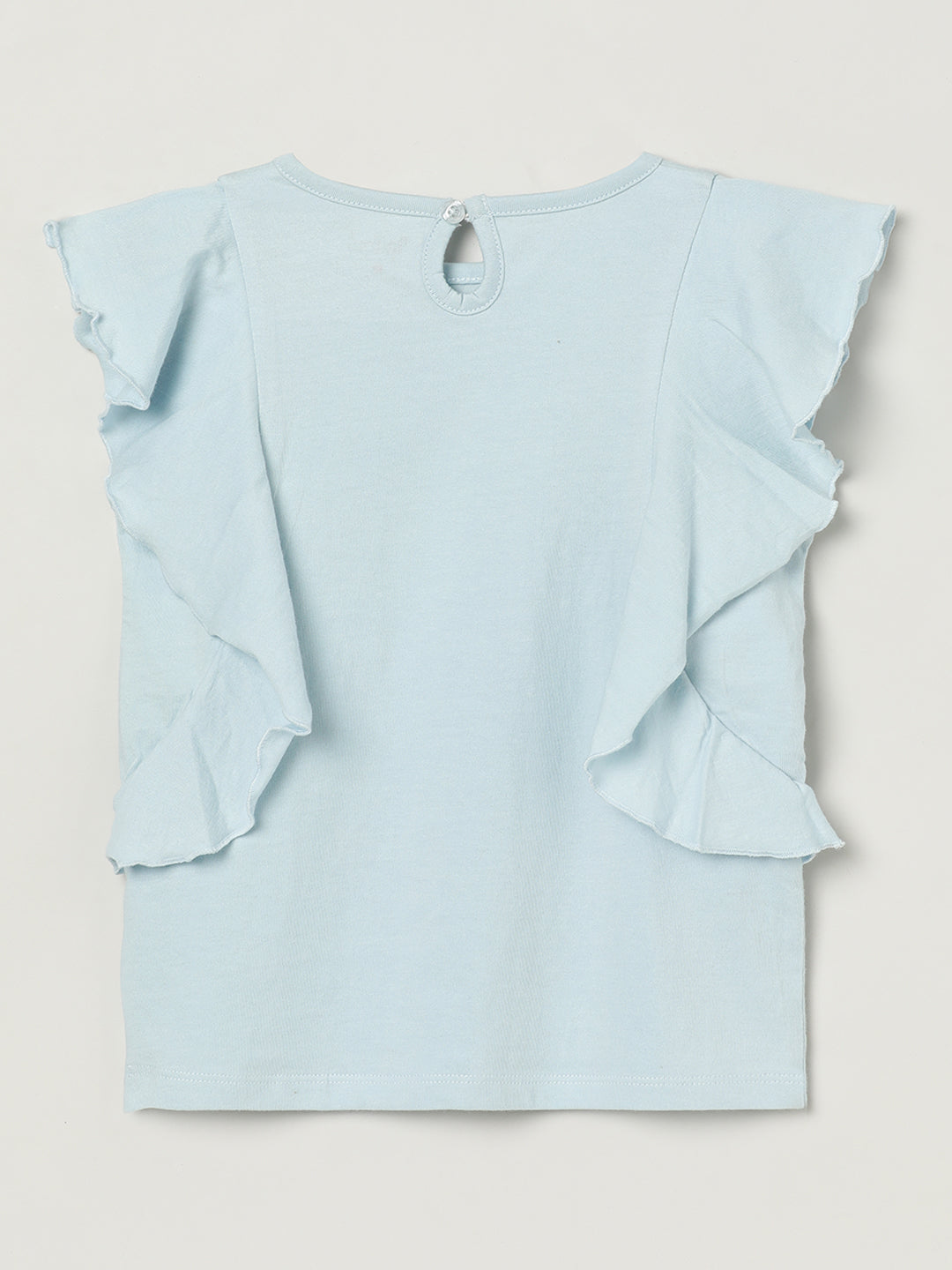 Chest printed top with ruffle detailing. Crafted with the soft 100% Cotton fabric, treated with bio wash, to ensure the safest and most comfortable clothing for the young ones.