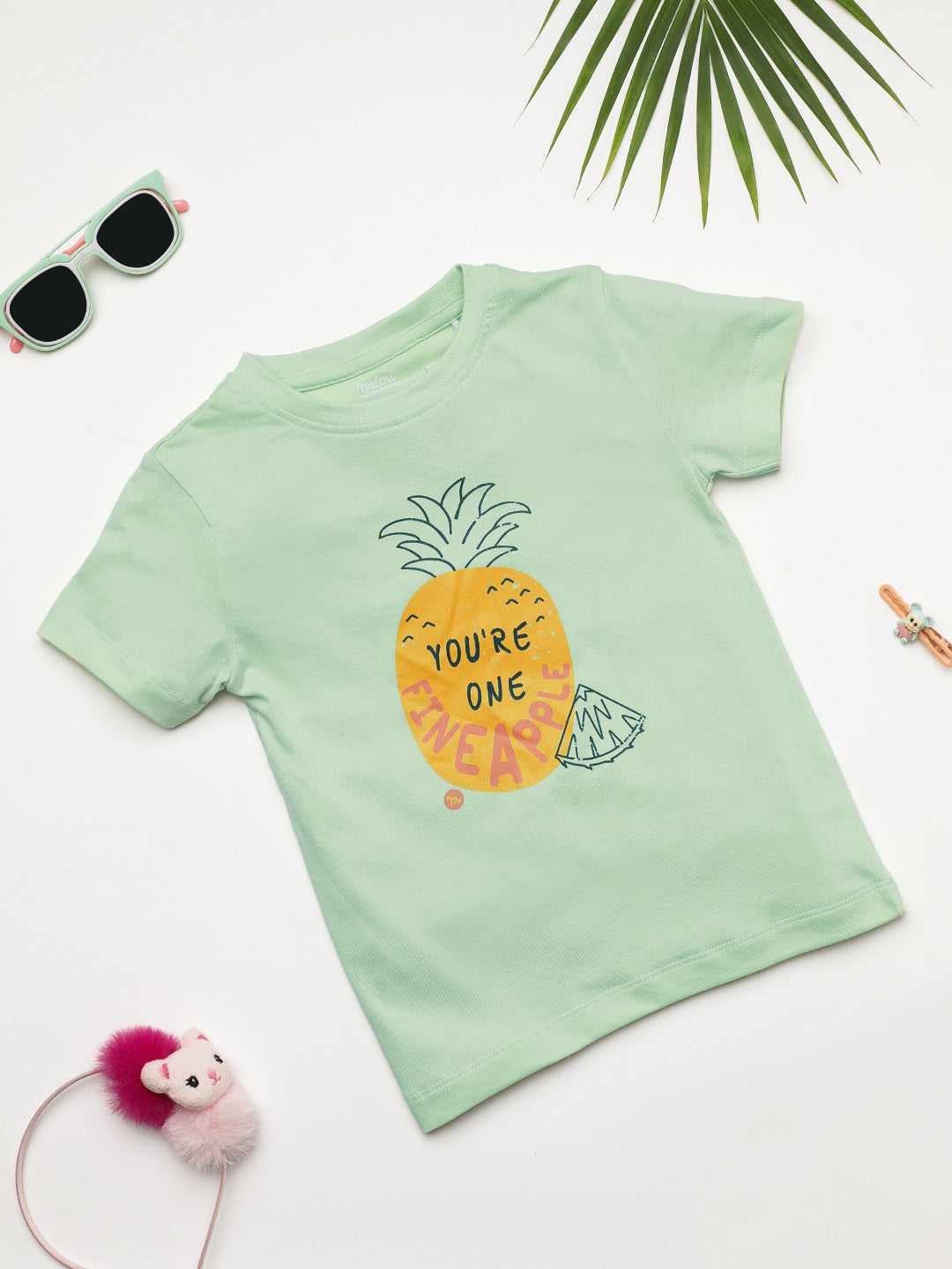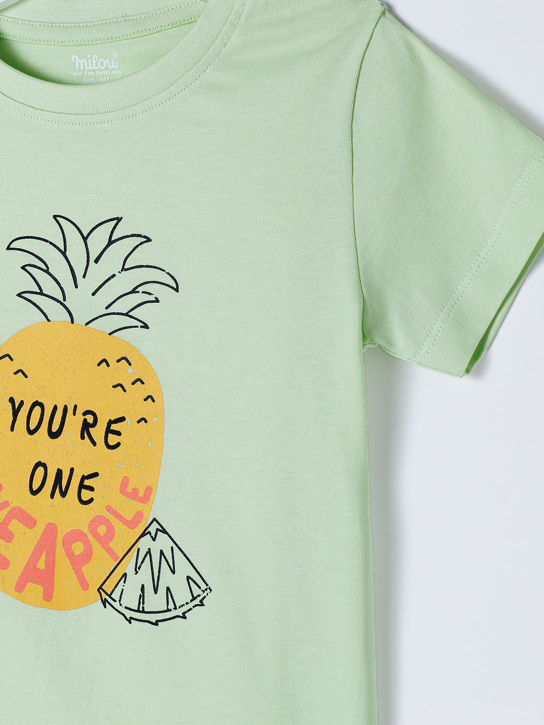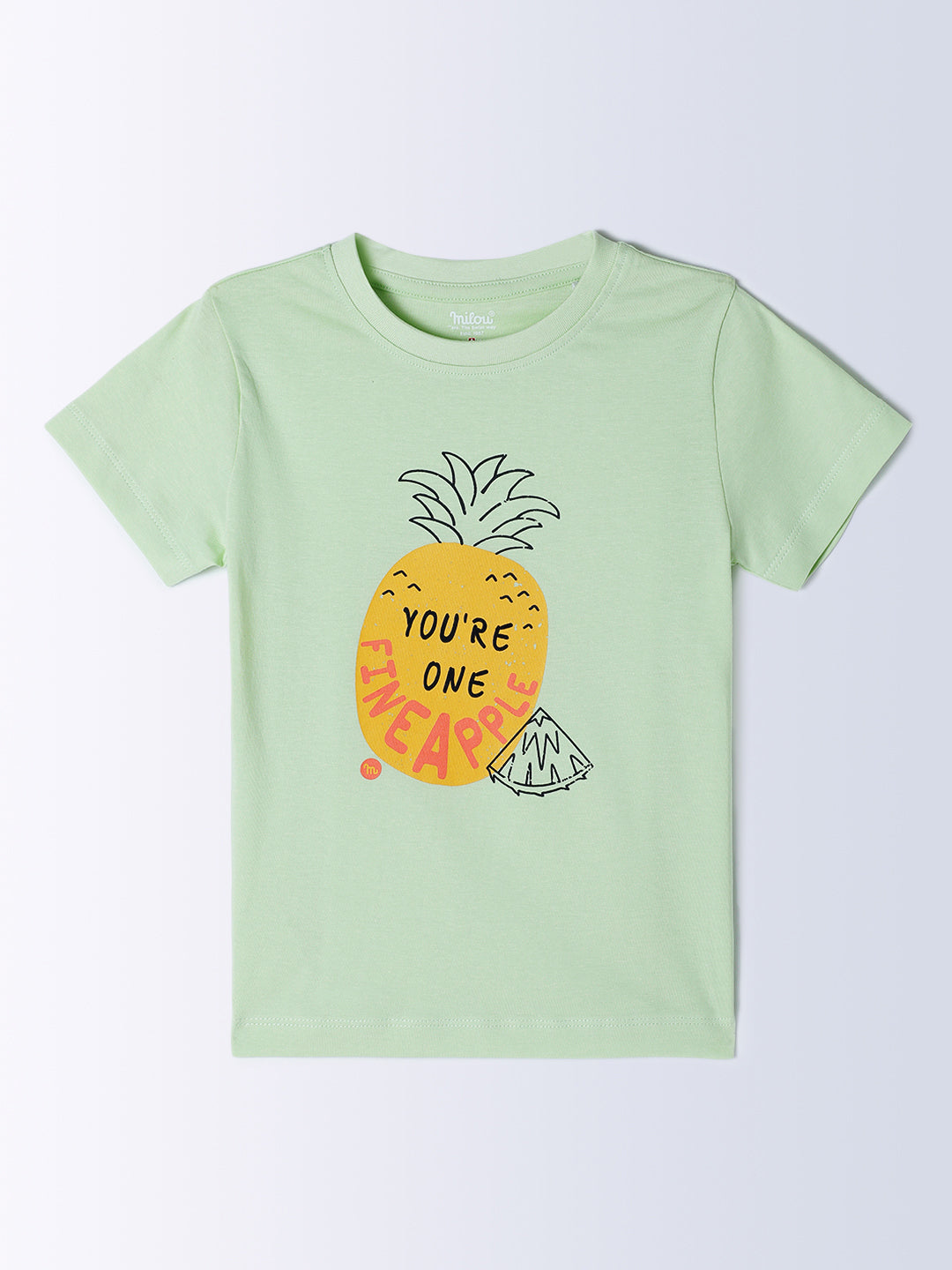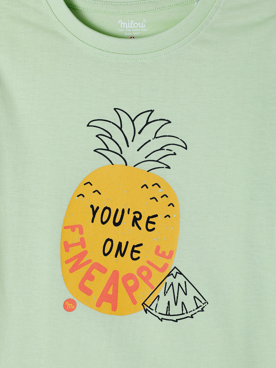 T-shirt with specialized print at chest, with Pineapple fragrance chest print activated by rubbing. Crafted with the soft 100% Cotton fabric, treated with bio wash, to ensure the safest and most comfortable clothing for the young ones.