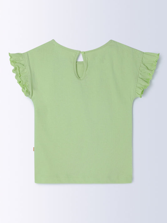 Milou Cotton Frilled Half Sleeves Bio Washed Placement Printed Top - Green
