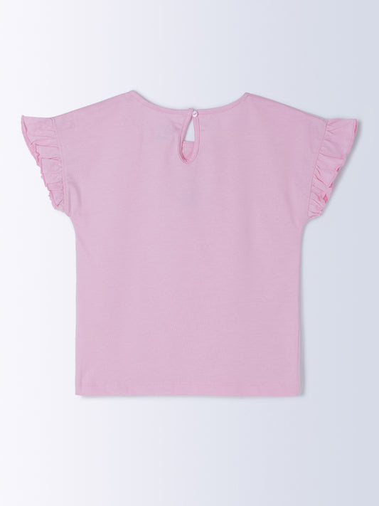 Milou Cotton Frilled Half Sleeves Bio Washed Placement Printed Top - Pink