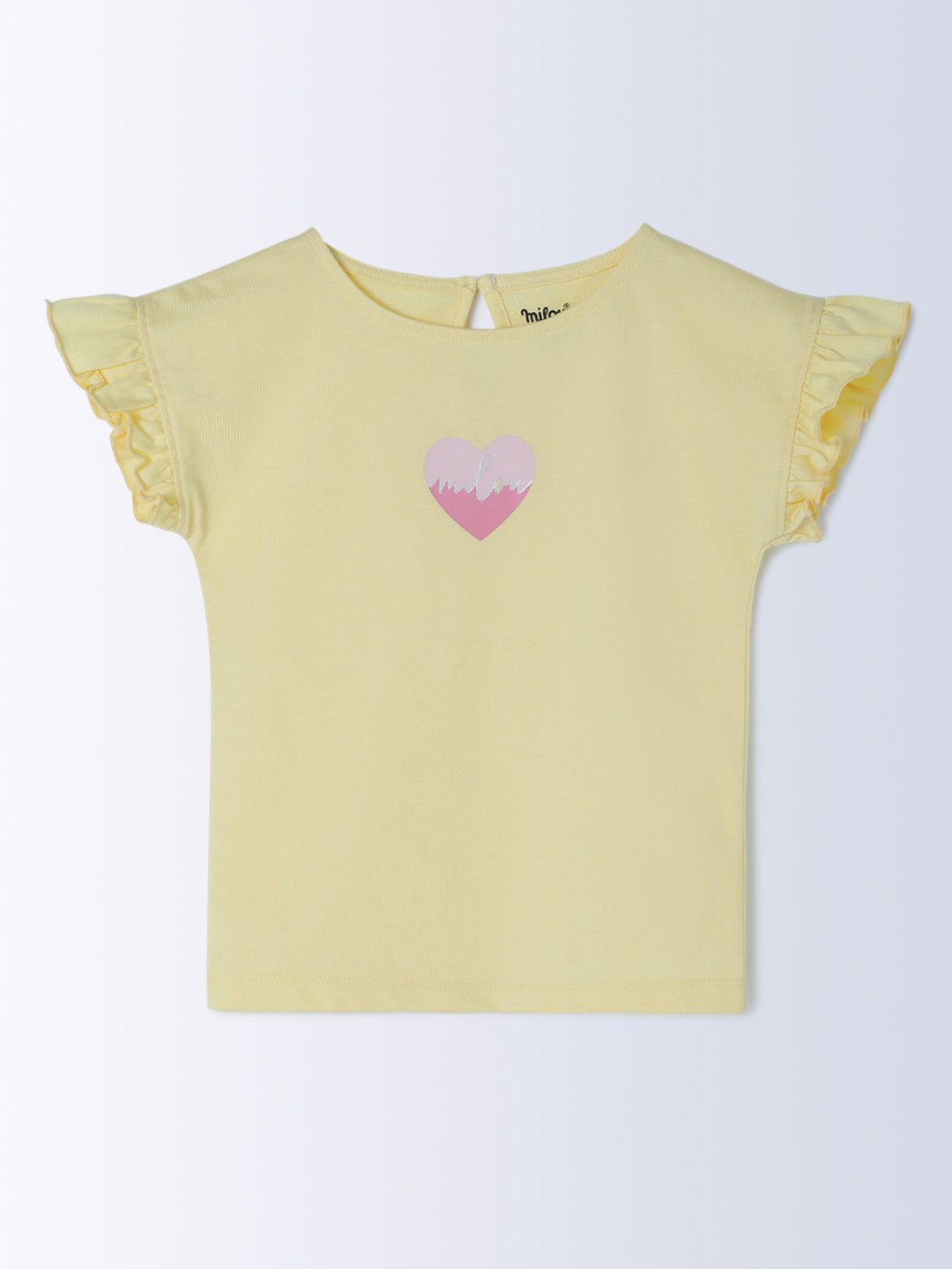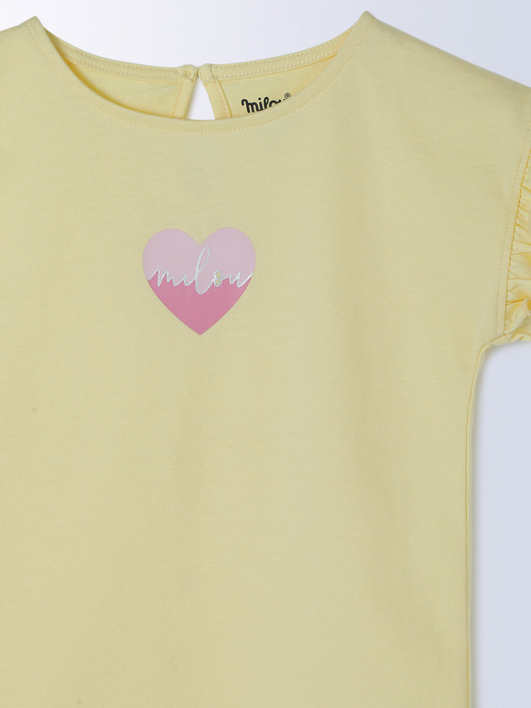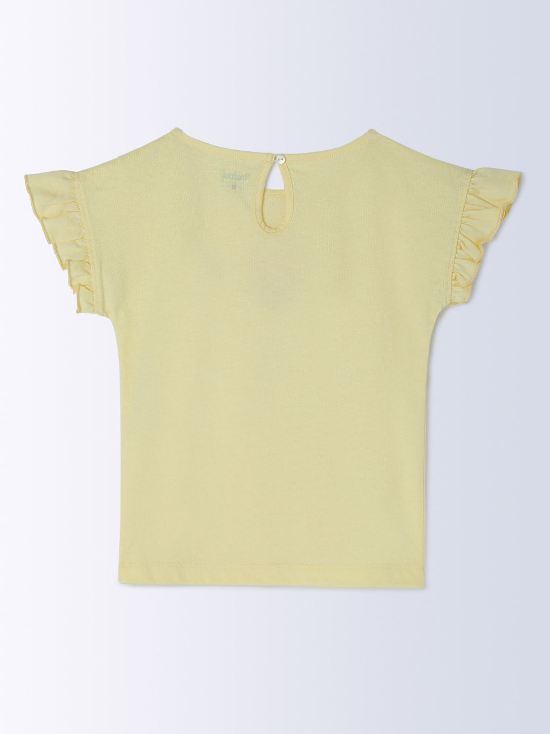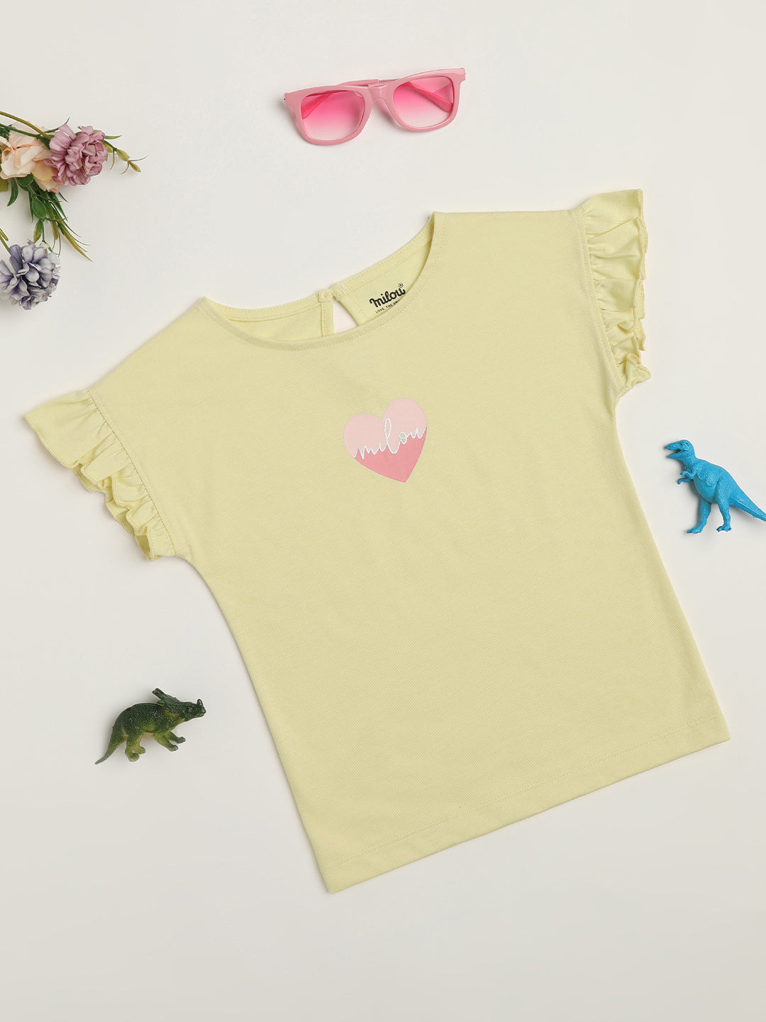 Solid top with print detailing at chest and ruffles at sleeves. Crafted with the soft 100% Cotton fabric, treated with bio wash, to ensure the safest and most comfortable clothing for the young ones.